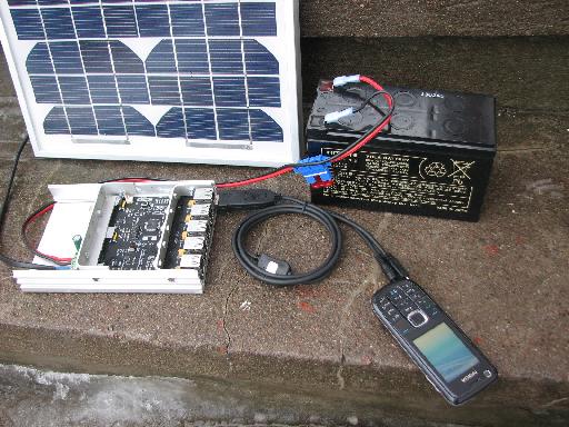 Designed to meet the needs for a small self-contained unit for bulk charging mobile phones, music-players etc. The station uses a solar panel (or small wind turbine) to charge battery to magazine energy so charging can be done on rainy, cloudy days or during night time. The station uses USB as unified power interface. USB is a popular common interface for most devices and telephones and many other gadgets. The station is designed for robustness. Chassis is a rugged aluminum case that also serves as heat sink for the power electronics. The design is based on the latest microprocessors technology. and uses powerful components, including high power FET's transistors for power control and versatile Hall elements for current sensing. The unit can be monitored, debugged and configured via USB. This needs a special cable and terminal program on the host computer. This is only intended for service and expert users. For normal operation the unit works out-of-the-box in an optimal way.